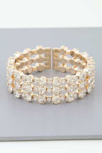 Enhance your accessory collection with our Triple Bejeweled Cuff Bracelet, a luxurious piece that combines bold design with sparkling elegance. This cuff bracelet is adorned with three rows of clear rhinestones, making it a statement piece that adds sophistication and shine to any look.